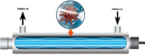 Vatten förorenat av. bakterier och mikroorganismer, kan vara skadligt och orsaka sjukdomar.           För att effektivt ta bort dessa sjukdomsalstrare i vattnet, används UV-strålning,